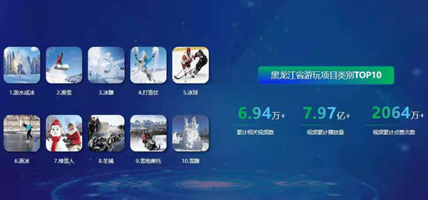 這些游客大部分選擇在冬季來到黑龍江,欣賞冰天雪地。冬季游玩項目是外地游客來黑龍江的源動力,2020年,黑龍江省游玩項目類短視頻TOP10中,潑水成冰類視頻深受用戶的喜愛,排在第一位,其次分別是:滑雪、冰雕、打雪仗、冰球、滑冰、堆雪人、冬捕、雪地摩托、雪雕等,所有游玩項目類視頻累計相關(guān)視頻數(shù)6.94萬+、播放量7.97億+、點贊次數(shù)2064萬+。