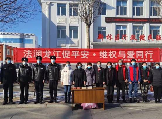 各聯(lián)動部門及巾幗志愿者在新林區(qū)行政服務(wù)中心前懸掛條幅,擺放宣傳資料,耐心地給過往的行人講解法律知識,并為現(xiàn)場群眾發(fā)放《民法典》折頁、《反家庭暴力法》《家庭教育促進法》《未成年人保護法》等宣傳冊。