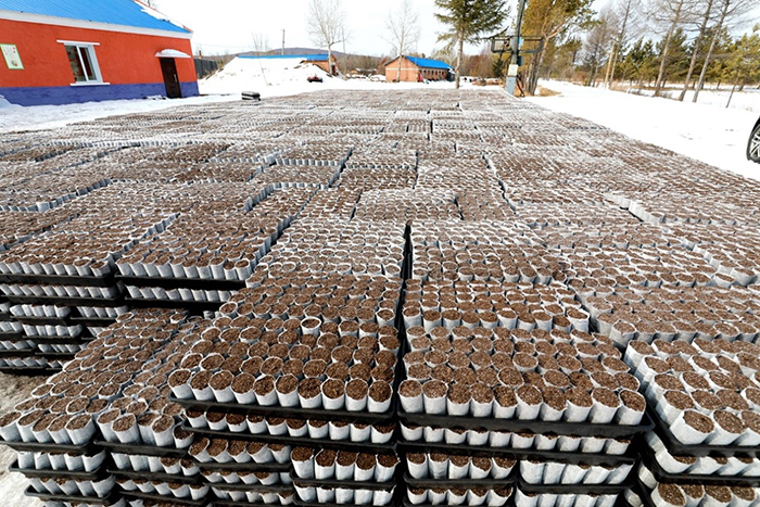 阿木爾林業(yè)局中心苗圃加工生產(chǎn)的輕基質(zhì)杯(王力 攝)