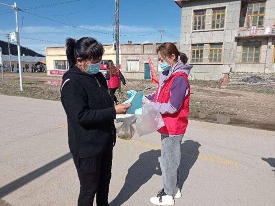 新林林業(yè)局大烏蘇林場(chǎng)“林海流星雨”志愿服務(wù)隊(duì)隊(duì)員在向居民發(fā)放防火宣傳單(劉志剛 攝)