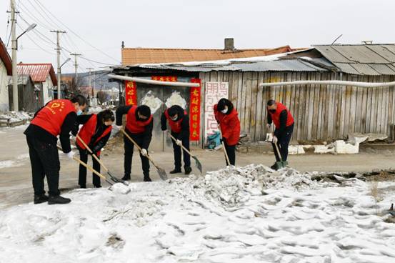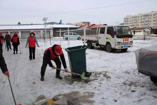 新林林業(yè)局機(jī)關(guān)科室“林海流星雨”志愿服務(wù)隊(duì)在居民區(qū)清掃積雪(崔紅霞 攝)