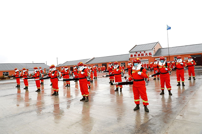 阿木爾林業(yè)局專業(yè)撲火隊員正在進行風(fēng)力滅火機科目演練(王力 攝)