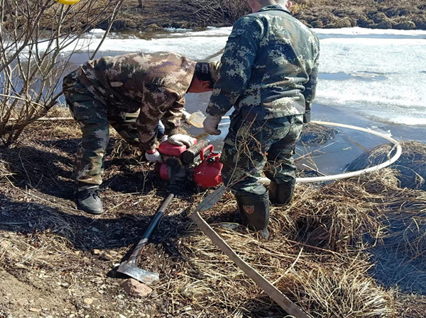加格達(dá)奇林業(yè)局組織工作人員利用水泵抽水助融(趙子敬 攝)