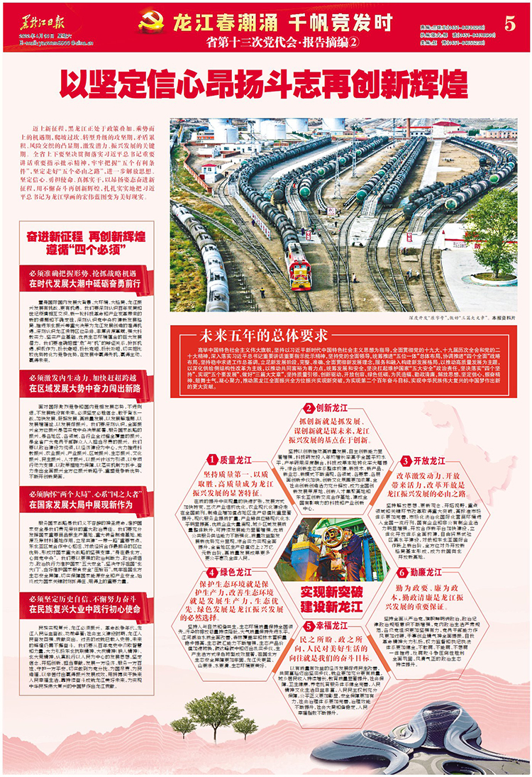 邁上新征程,黑龍江正處于政策疊加、乘勢而上的機(jī)遇期,爬坡過坎、轉(zhuǎn)型升級的攻堅期,矛盾累積、風(fēng)險交織的凸顯期,激發(fā)潛力、振興發(fā)展的關(guān)鍵期。全省上下要堅決貫徹落實(shí)習(xí)近平總書記重要講話重要指示批示精神,牢牢把握“五個有利條件”,堅定走好“五個必由之路”,進(jìn)一步解放思想、堅定信心、勇?lián)姑⒄孀?shí)干,以昂揚(yáng)姿態(tài)奮進(jìn)新征程,用不懈奮斗再創(chuàng)新輝煌,扎扎實(shí)實(shí)地把習(xí)近平總書記為龍江擘畫的宏偉藍(lán)圖變?yōu)槊篮矛F(xiàn)實(shí)。