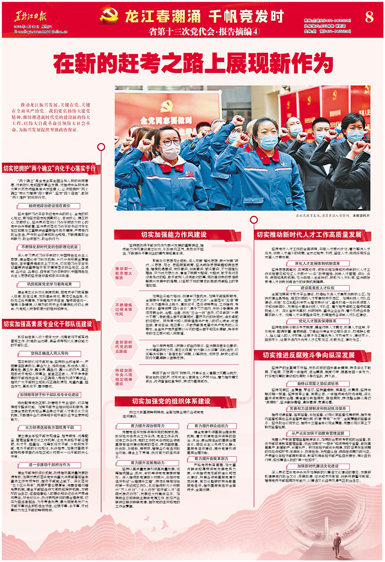推動龍江振興發(fā)展,關鍵在黨,關鍵在全面從嚴治黨。我們要弘揚偉大建黨精神,繼續(xù)推進新時代黨的建設新的偉大工程,以偉大自我革命引領偉大社會革命,為振興發(fā)展提供堅強政治保證。