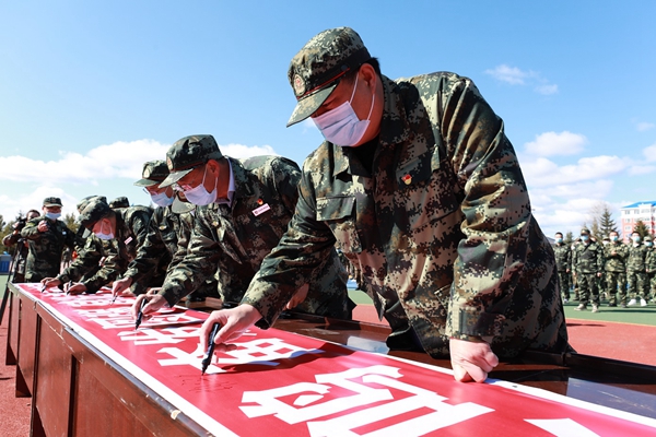 阿木爾林業(yè)局處級領(lǐng)導(dǎo)在印有“牢記歷史 警鐘長鳴 奮發(fā)圖強 建設(shè)美麗家園”的宣傳條幅上簽名(王力 攝)