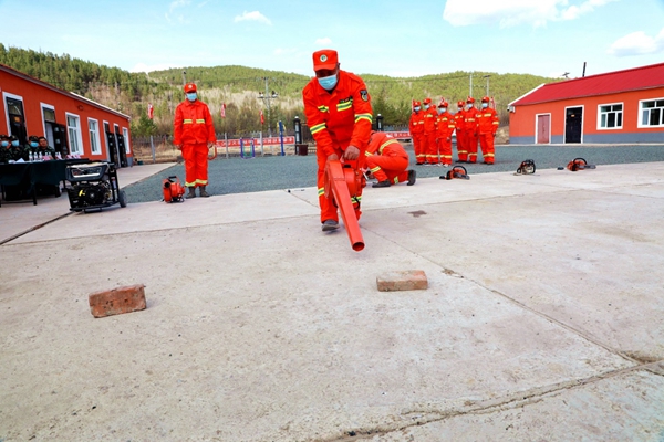 阿木爾林業(yè)局綠林林場(chǎng)專(zhuān)業(yè)撲火隊(duì)員在進(jìn)行風(fēng)力滅火機(jī)、油鋸的拆裝維修使用比賽(王力 攝)