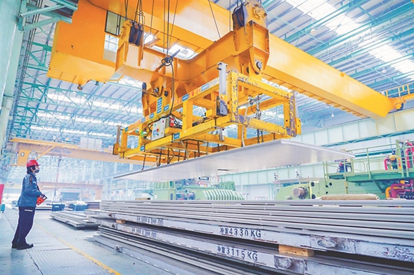生產(chǎn)人員對軋制完成的鋁板進行吊運。 黑龍江日報全媒體記者 韓麗平攝